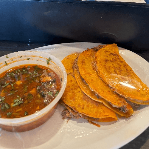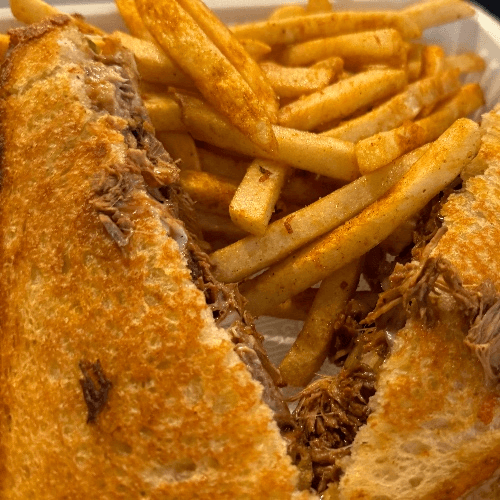 Viral on Instagram- Two Pieces of Sourdough Bread , Beef slowly simmered in a house-made red broth, served with melted Cheese, Onions, Cilantro, and a side of Consomé with a side of our house seasoned fries