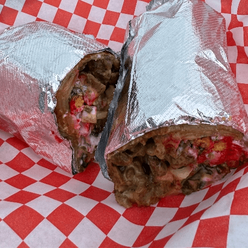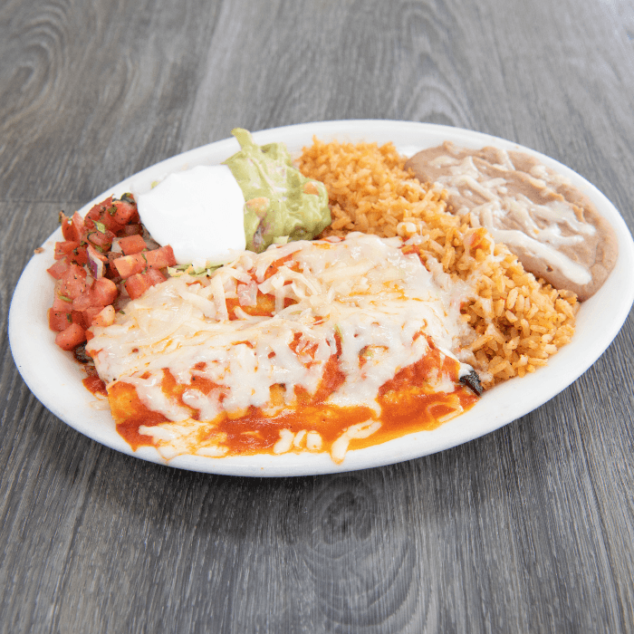 Fried Tortilla , Filled With a choice of meat, Rice , Beans Spicy Red Salsa and Cheese
